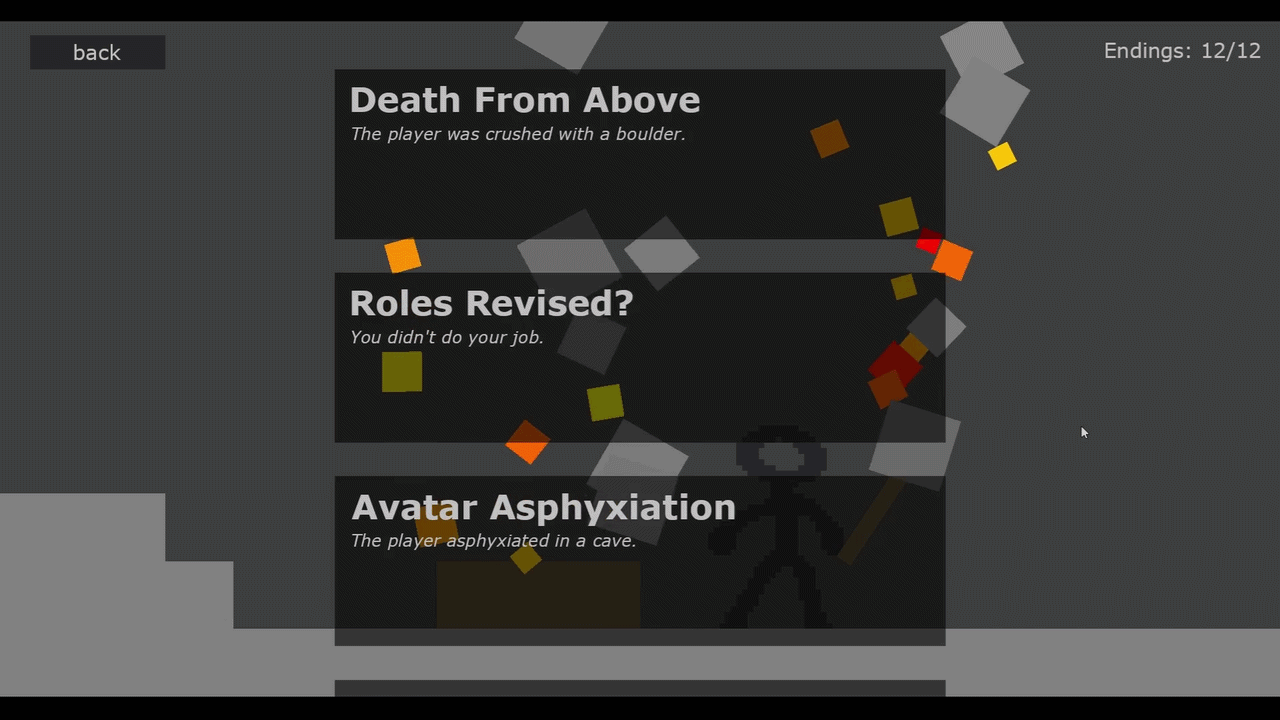 By the end of our call, we had a little stick figure man who walked right, mined a tree, walked left, lit a torch, and could die in a variety of exceedingly outlandish ways. And we thought it was the funniest thing. Thanks to SimulationFramework, we were able to make some slick menus that helped contextualize the game as more than an idle program and encouraged players to seek out the different endings achievable through creative use of elemental afflictions.