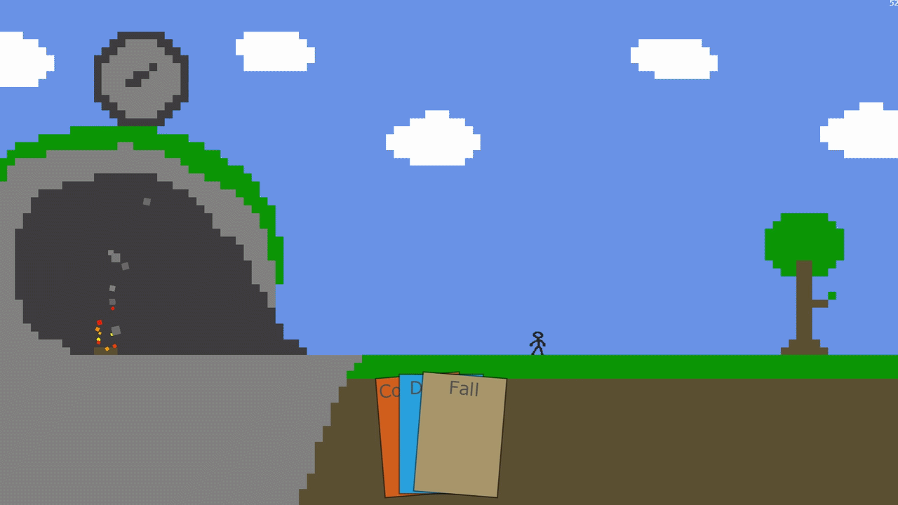 Torch is a 2D survival sandbox game akin to Terraria. However, your goal is not to explore, survive, and conquer the game world. Rather, you play as the world itself, attempting to thwart the progression of an AI-controlled player-character. Utilize three elemental effect cards to manipulate the world in creative ways to stop Torch Guy. Can you discover all 12 endings?