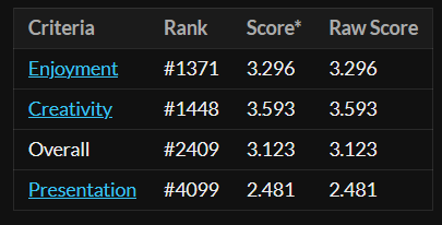 By the conclusion of the jam, over 140 people had played our little game. We received comments, critique, and congratulations on our work, and placed in the top 36% of the 6,688 entries.